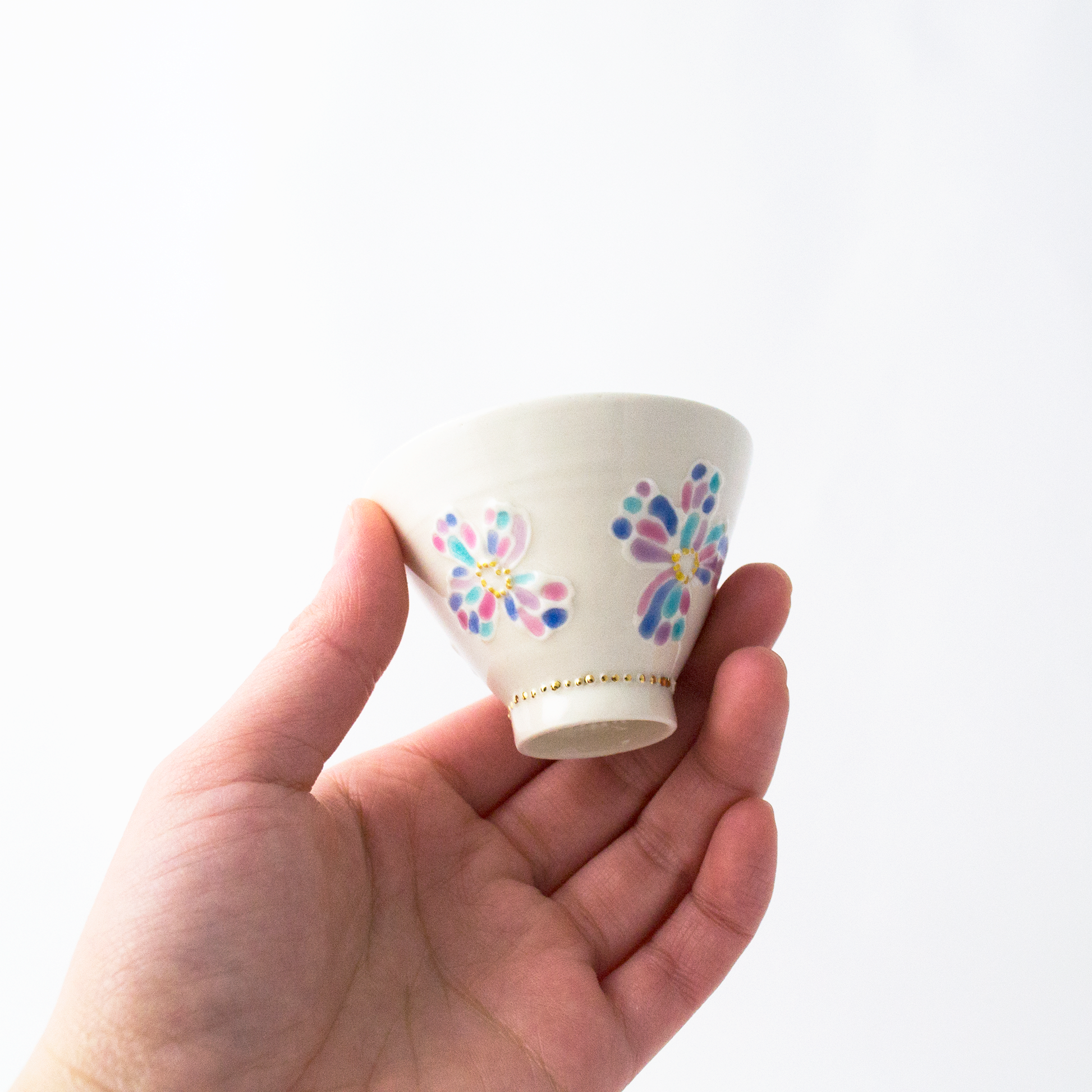 少しクリーム色がかった白い磁器に、九谷の上絵具をつかっており、透明感のある色味がきれいです。金彩もしているので、華やかさがあります。日本酒などにいかがでしょうか。